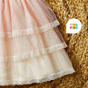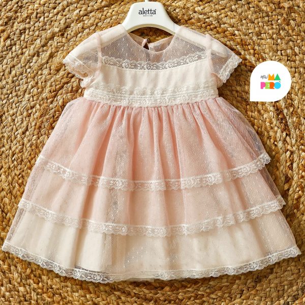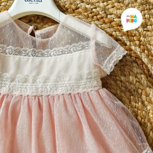 Abito Aletta rosa per le dolci occasioni delle vostre piccoline. Ricamo su tulle con applicazioni in pizzo.