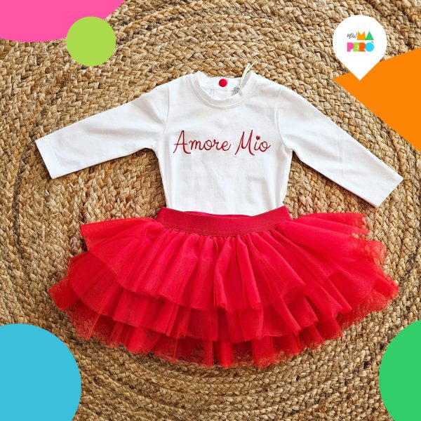 Completo artigianale composto da gonna in tulle e maglia in cotone con la scritta in ricamo AMORE MIO