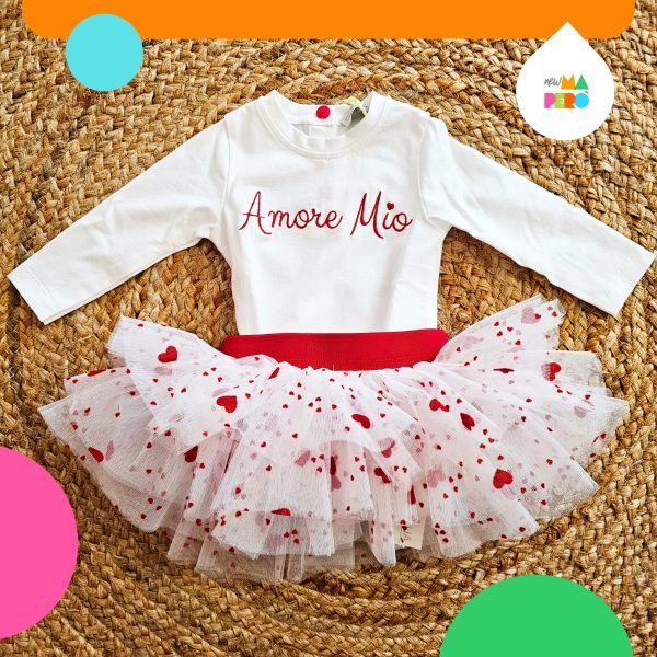 Completo artigianale composto da gonna in tulle con cuoricini in velluto e maglia con la scritta in ricamo AMORE MIO