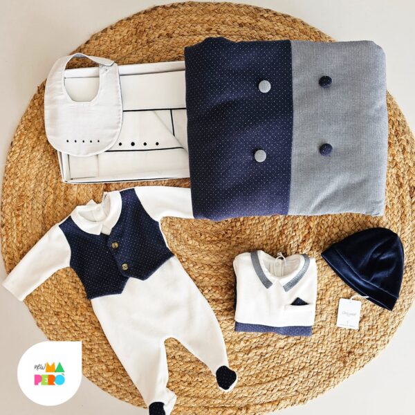 Dolcissimo corredino maschietto bianco, blu e grigio a pois in ciniglia.