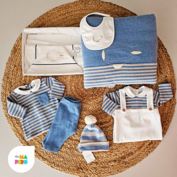 Composto da copertina, lenzuolino, cappellino, bavetta, tutina intera e due pezzi.