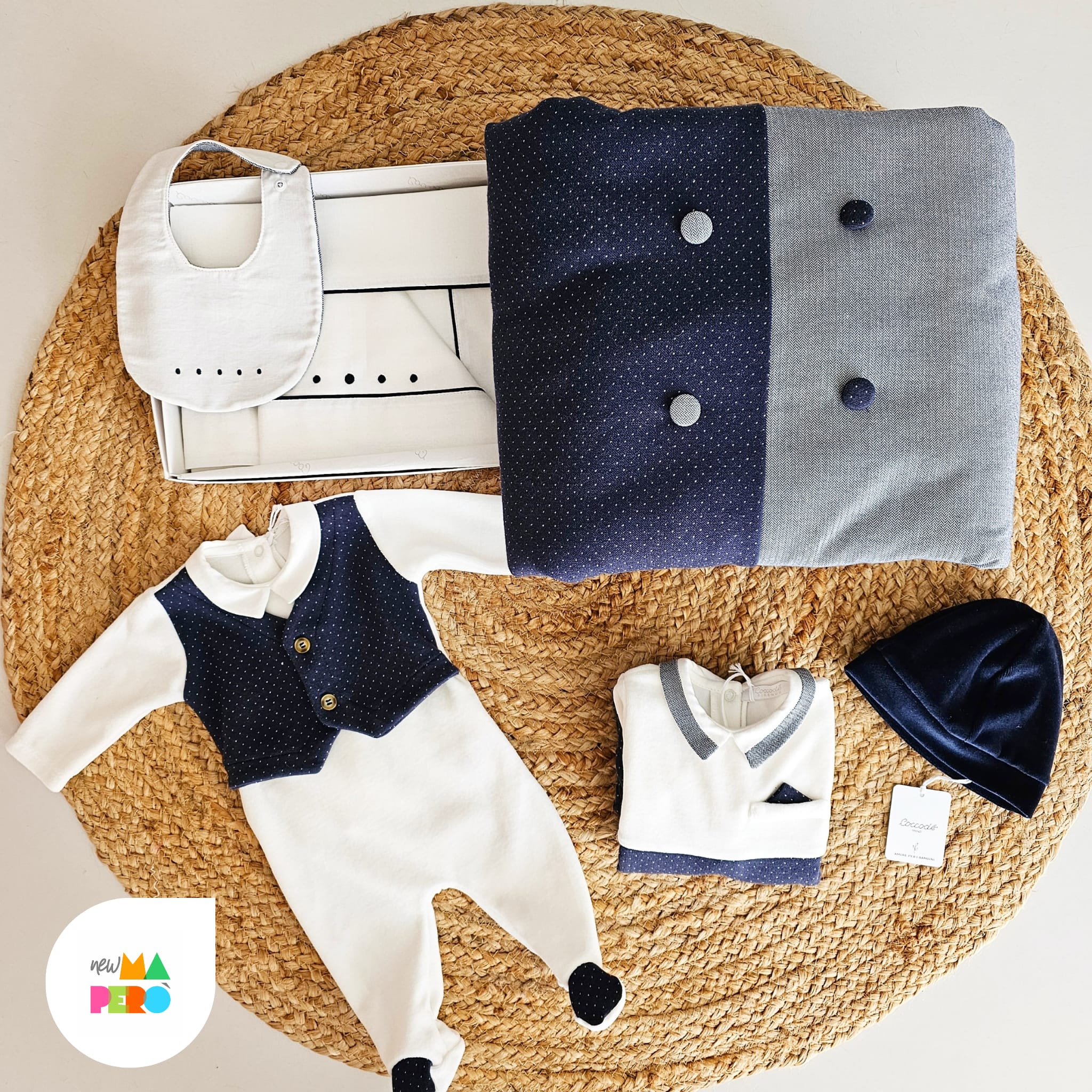 Completo di copertina sfoderabile, lenzuolino, cappellino blu in ciniglia e tutine intere.